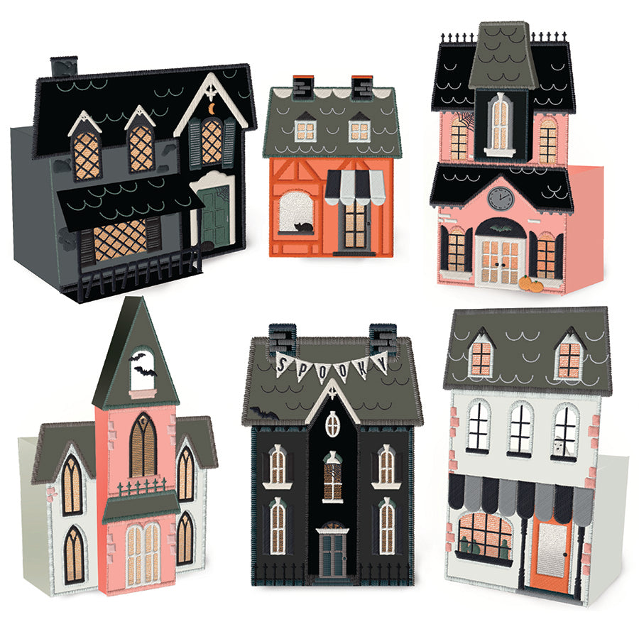 Step into the whimsical world of Frank ’n Town, a spooky and playful machine embroidery collection inspired by My Mind’s Eye’s charming Halloween illustrations. Freestanding applique and freestanding lace combine to create a clever reverse-applique effect. The lace windows are designed to glow with the addition of a battery-powered light, and built-in light boxes create the perfect backdrop for an eerie glow. You’ll also love the 3D elements—bats, pumpkins, banners, verandas, and more—adding depth and detail to your display.